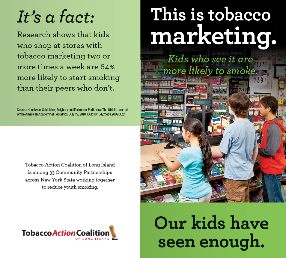 Tobacco marketing refers to the posters and signs inside and outside stores, as well as the colorful, well-lit displays of tobacco products behind the counter in most convenience stores, gas stations, pharmacies and grocery stores.